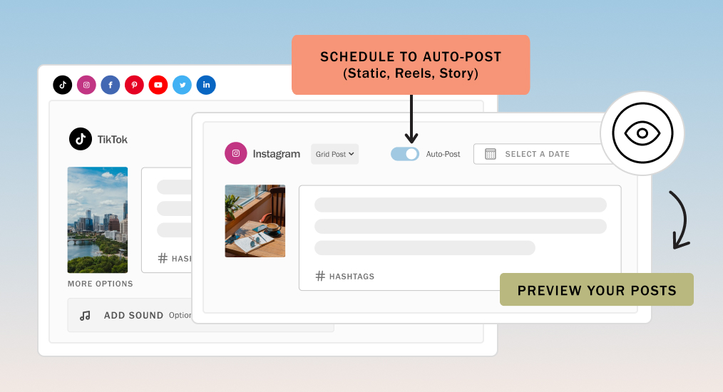 - Auto-posting to your most important channels like Instagram, TikTok, YouTube and more