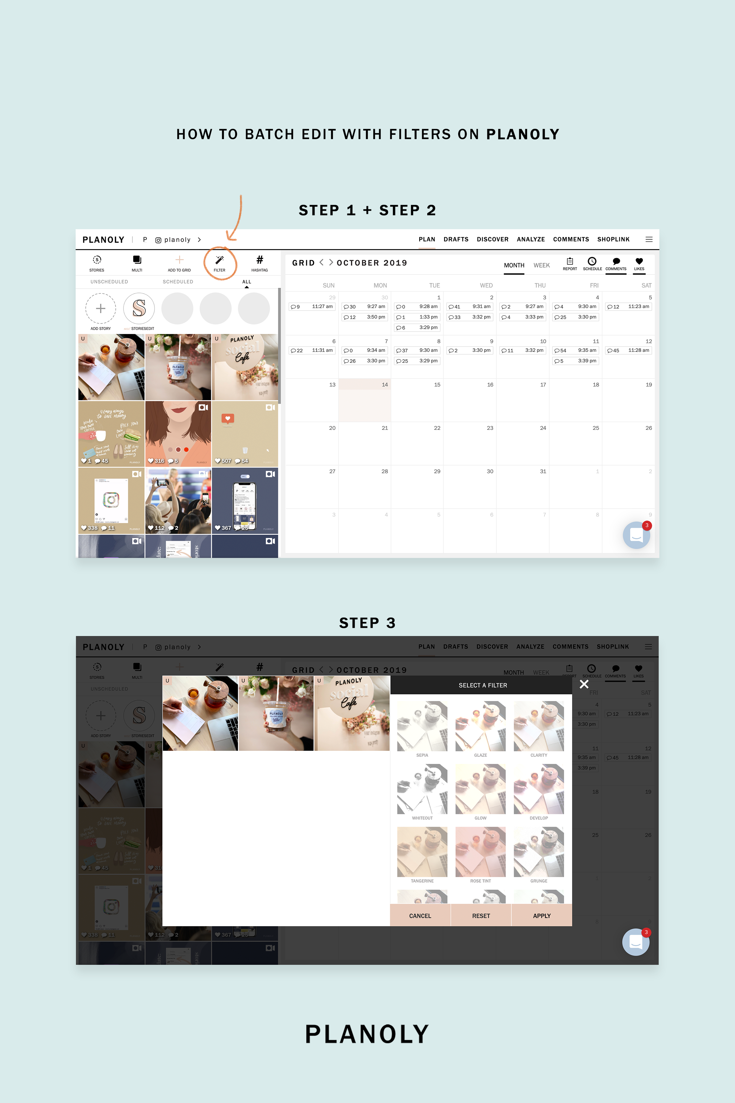 By batch editing on PLANOLY, you'll take one extra step away from your planning strategy. If you have auto-posting set up, all you'll need to do is schedule your content, and it's good to go! Learn more about our Auto-Post featurehere. We hope you enjoy all of the new filter options to enhance your images. Which filters are your favorite? Send us a direct message on Instagram to let us know
